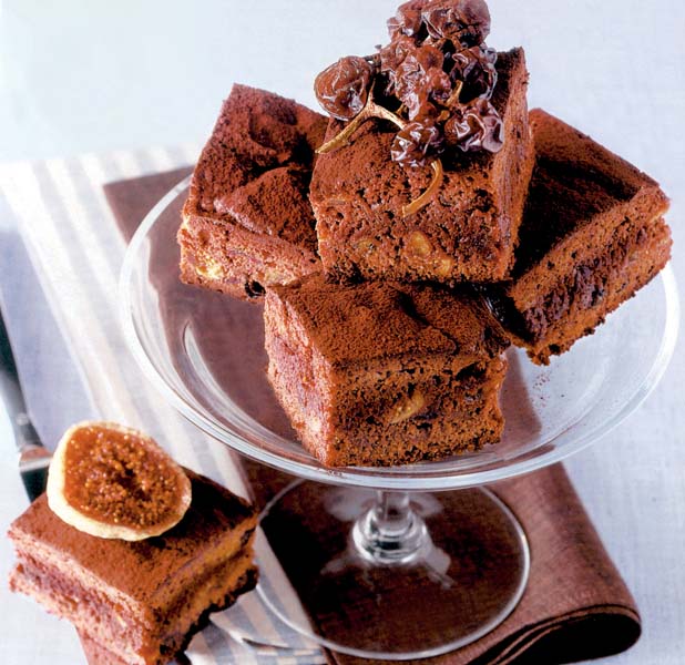 2. Se freacă untul cu zahărul şi zahărul vanilat până se topeşte zahărul, apoi se adaugă crema de ciocolată şi la sfârşit gălbenuşurile adăugate pe rând. Se toarnă în ploaie făina cernută, albuşurile bătute spumă, coaja rasă de lămâie şi fructele tăiate cubuleţe. Se amestecă uşor, se toarnă într-o tavă tapetată cu hârtie de copt şi se coace în cuptorul încins, la foc potrivit 20-25 de minute.