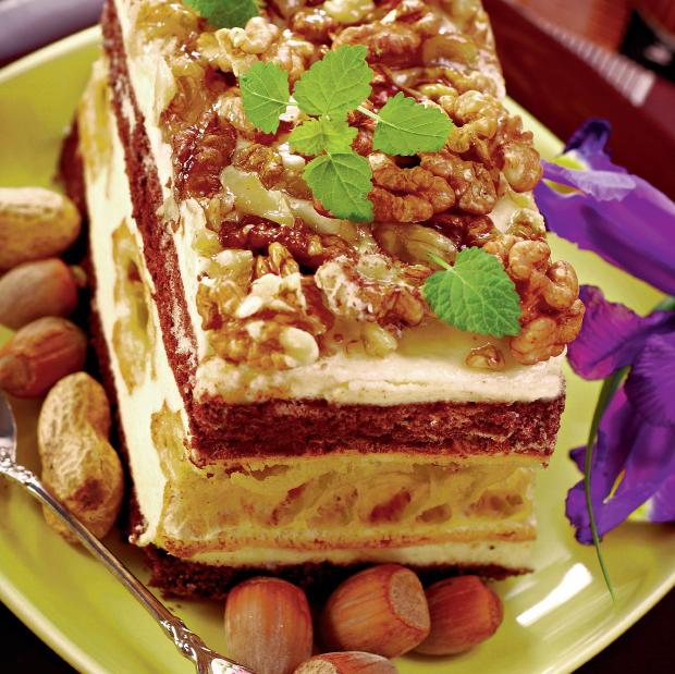 5. Între timp, se caramelizează nuca cu zahărul topit în apă. După ce s-a scos tava din cuptor, se pune deasupra miezul de nucă caramelizat şi se taie în bucăţi potrivite. Se ornează cu frunzuliţe de mentă, alune de pădure şi alune în coajă.