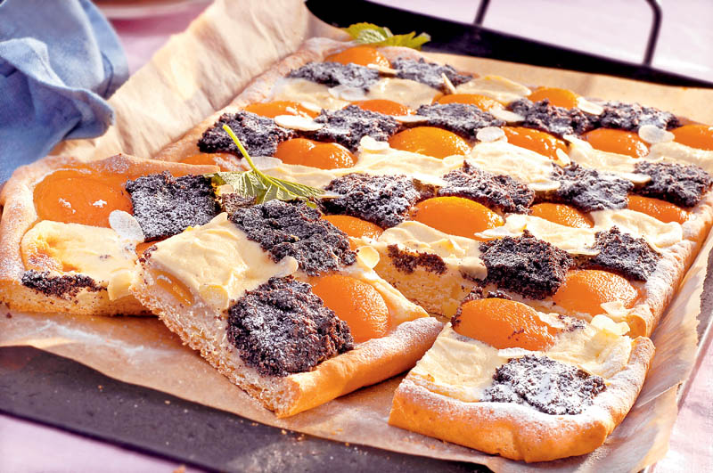 4. Aluatul cresut se întinde într-o foaie subţire şi se aşază într-o tavă tapetată cu hârtie de copt. Deasupra se pun jumătăţi de caise, compoziţia de brânză dulce şi macul şi se coace în cuptorul încins, la foc potrivit, 35-40 de minute. Se lasă să se răcească şi se ornează cu migdale fin tăiate şi zahăr pudră.