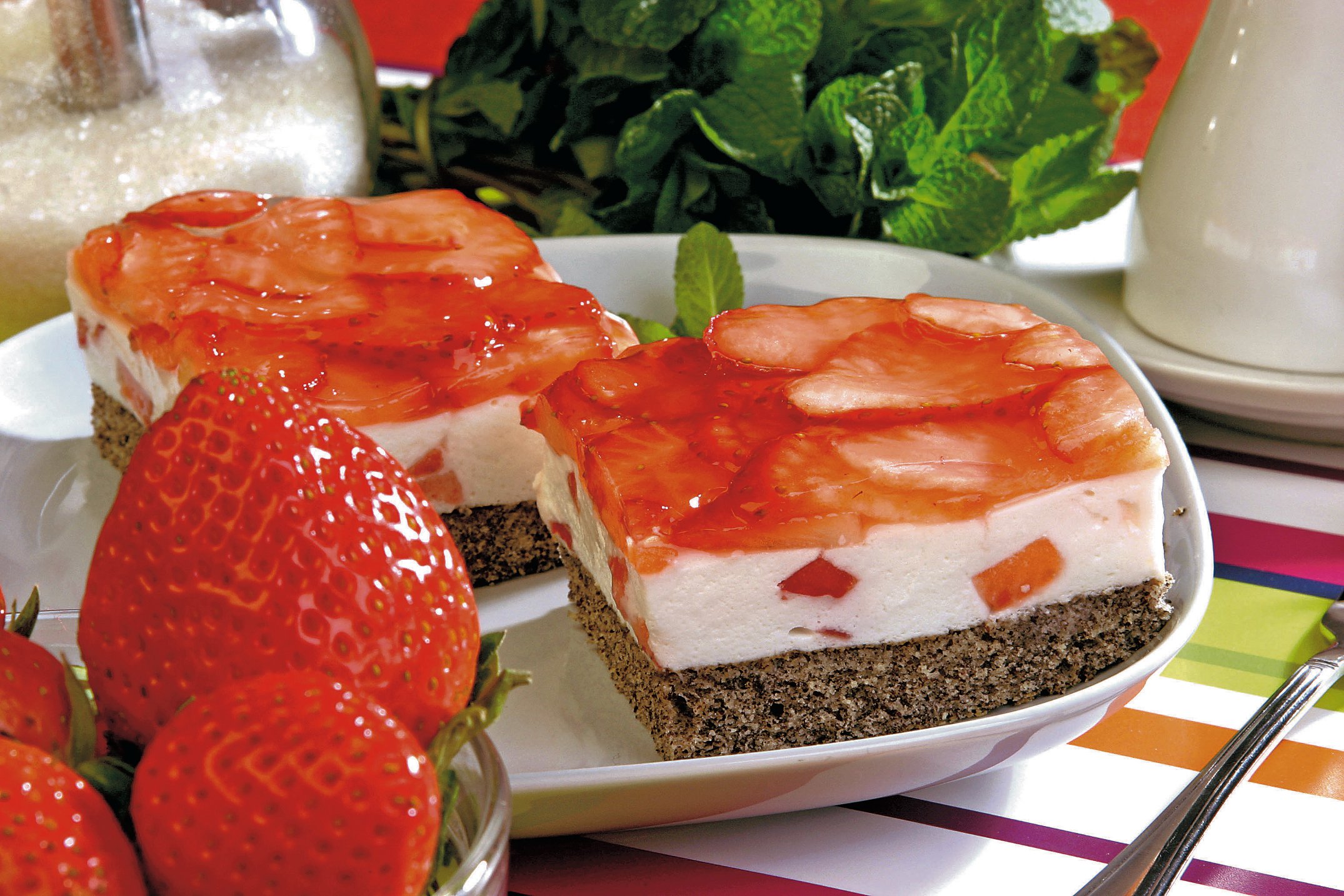 2. Gelatina se lasă la înmuiat în apă rece. Căpşunile se spală şi se curăţă. Se separă 200 g pentru ornat, iar restul de 300 g se taie mărunt. Frişcă se bate spumă cu două linguriţe de zahăr şi zahărul vanilat şi se păstrează la frigider. Gelatina înmuiată se topeşte la cald (60-70˚C) şi se amestecă cu smântâna bătută cu restul de zahăr, frişca şi căpşunele tăiate mărunt. Se toarnă în strat uniform pe blatul copt şi răcit, apoi se ornează cu felii de căpşune stropite cu zeamă de lămâie şi jeleu de fructe. Jeleul de fructe se prepară conform instrucţiunilor.