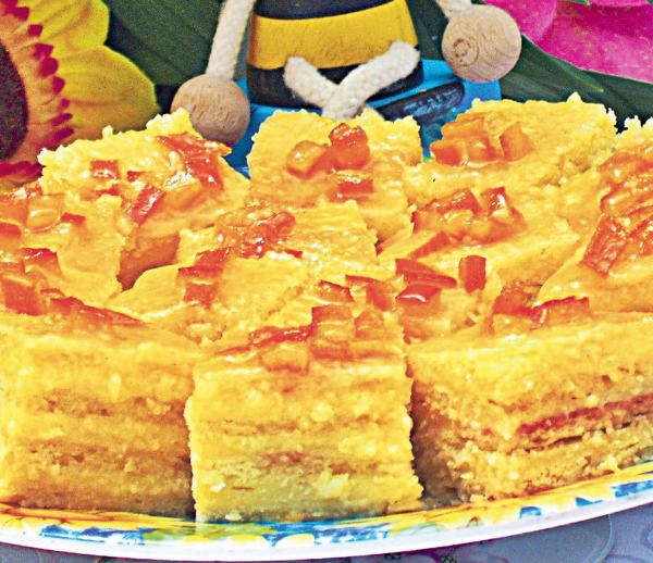 4. Se monteaza prajitura ungând foile cu crema calda, întinsa în strat uniform pe ele, apoi se suprapun una peste alta, presând usor cu mâna. Deasupra prajiturii se toarna siropul cald fiert cu coaja de portocala, puin câte puin, pentru a fi absorbita de foaie, apoi se împart uniform deasupra prajiturii cubuleele de coaja. Se lasa sa se raceasca, cel puin 2 ore, apoi se taie în bucaele potrivit de mari.