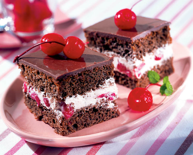3. Blatul copt şi răcit se taie în două. Se aşază o foaie pe un platou şi se unge cu crema de ciocolată. Se presară vişine confiate şi se acoperă cu cea de-a doua foaie de blat. Se acoperă cu glazură de ciocolată şi se ornează cu vişine confiate.