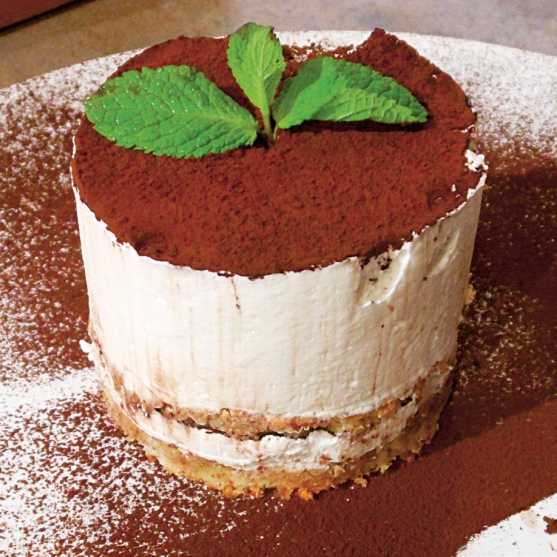 4. Se pregăteşte tava astfel: primul blat se pune pe fundul tavii şi se însiropeaza cu jumatate din cantitatea de cafea, apoi se toarna jumatate din crema şi se niveleaza. Se presara cu un strat de cacao, apoi se repeta operaţiunea anterioara cu celalalt blat şi restul de crema, dupa care se orneaza din nou cu cacao din plin. Înainte de servire, se ţine la rece timp de 2 ore.