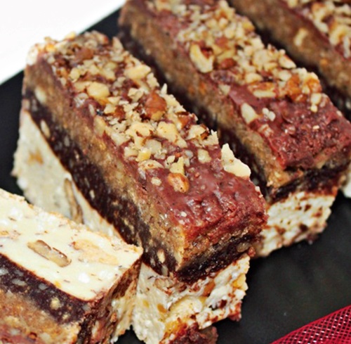 4. Se toarna compoziţia cu cacao peste partea alba din tava si se preseaza bine, apoi se pune si cea simpla. Se unge cu crema de ciocolata si se presara nucile taiate bucaţi mici. Se da tava la rece pâna se întareste prajitura.