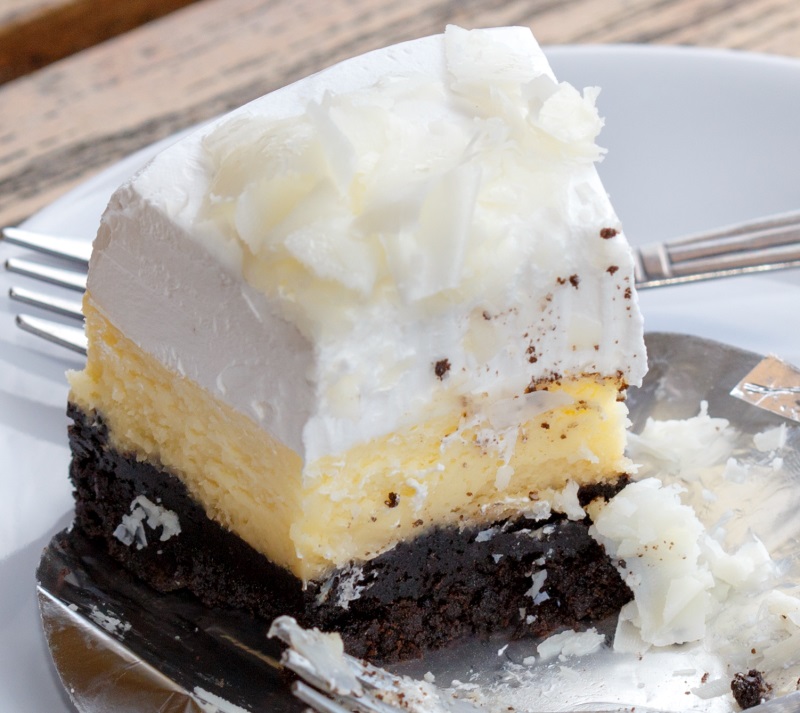 6. Crema 1 se pune peste blat și se întinde bine cu lingura. Pest ea se adaugă crema 2. Se lasă la frigider câteva ore înainte de a fi tăiată.