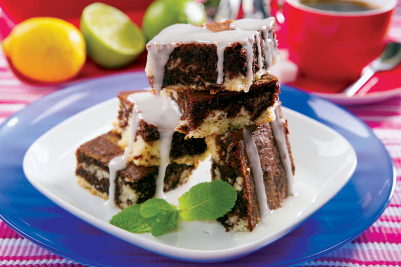 3. Prăjitura rece se taie bucăţi şi se ornează cu glazură de lămâie. Pentru glazură se freacă zahărul pudră cu zeama de lămâie până se dizolvă zahărul şi se obţine o cremă albă, spumoasă.