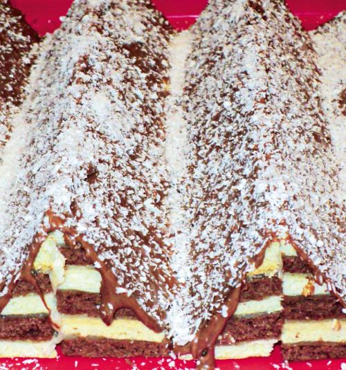 3. Dupa presare, se taie fâsii de 5 cm laime (ar trebui sa iasa 6-7 fâsii), apoi se taie pe diagonala si se lipesc între ele cu crema din cana oprita cu o zi înainte. La final, trebuie sa aiba forma unui munte. Se îmbraca în crema de ciocolata din comer, topita la bain-marie iar pe deasupra se presara fulgi de nuca de cocos.