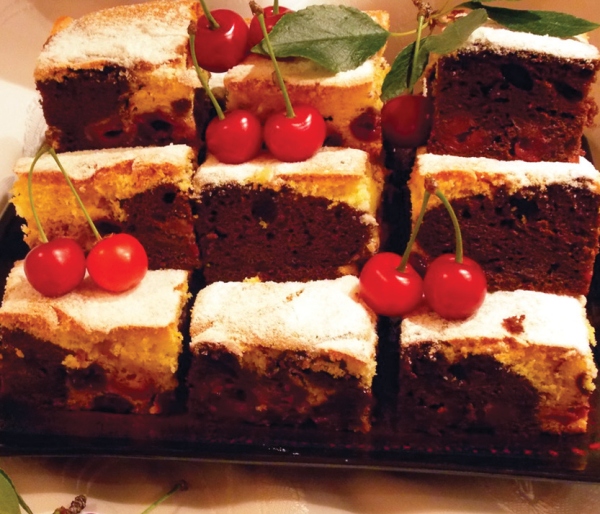 3. Într-o tava tapetata cu hârtie de copt, se pun cu lingura, pe rând, din ambele aluaturi, pâna se termina. Deasupra, se pun uşor cireşele şi se dau la cuptorul preîncalzit, la foc potrivit 25-30 de minute. Se opreşte focul şi se lasa tava în cuptorul deschis înca 10 minute. Se scoate din cuptor şi se lasa sa se raceasca, apoi se pudreaza cu zahar pudra şi se taie.