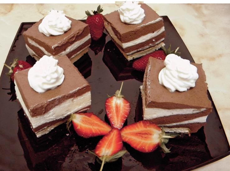 7. Se opreşte puţină frişcă pentru ornat, iar restul se amestecă în cremă. Se împarte compoziţia în 2 părţi: în una se pun 2 linguri de cacao şi în cealaltă zahărul vanilat. Se mai lasă puţin la frigider, 15-20 de minute.