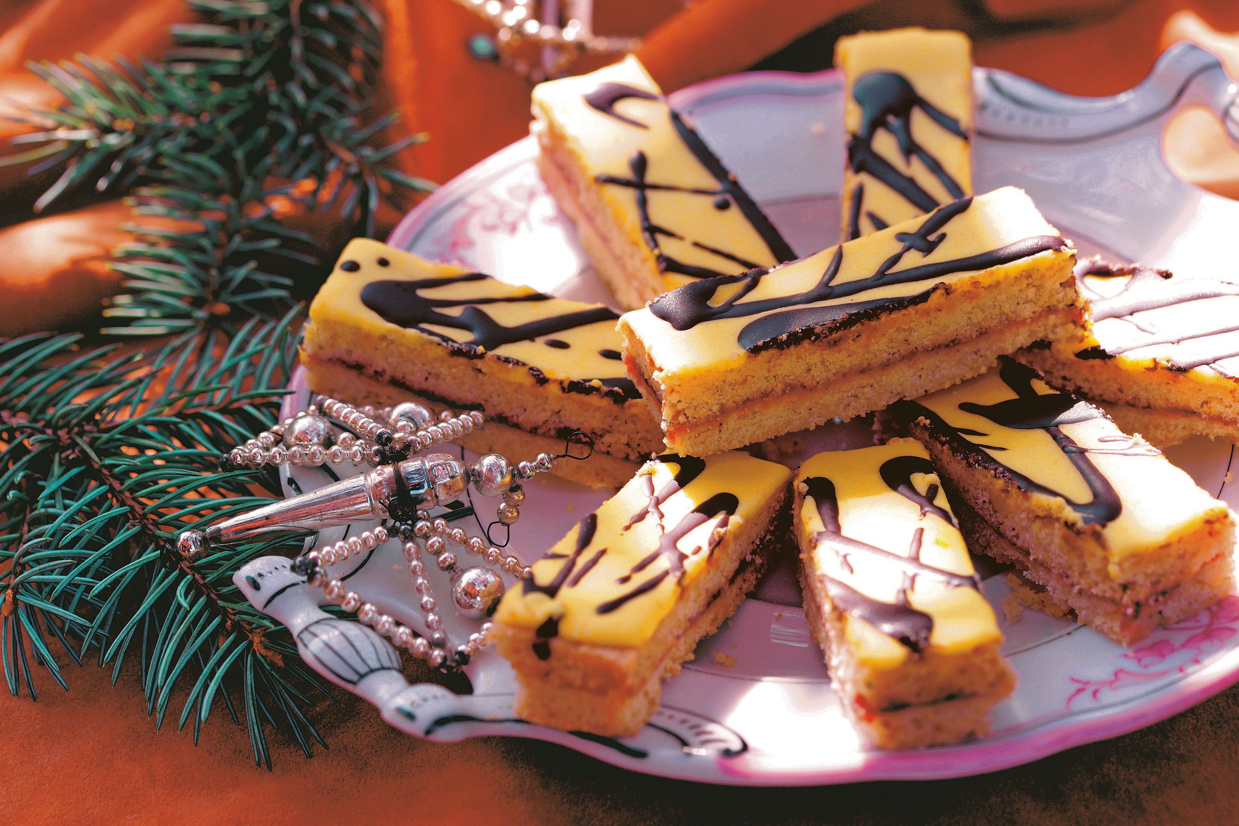 4. Pentru glazură, se bat deasupra unui vas cu apă clocotită gălbenuşurile cu zahărul şi zeama de portocale până se topeşte zahărul. Se întinde pe toată suprafaţa prăjiturii. Se ornează cu ciocolată şi se lasă să se întărească. Se taie şi se serveşte ziua următoare.