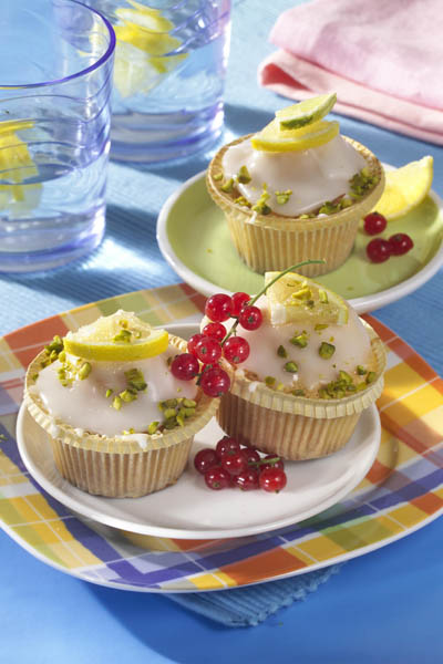 3. După ce s-au răcit, se toarnă glazura peste ele şi se ornează cu feliuţe de lămâie pudrate cu zahăr, miez de fistic şi coacăze.