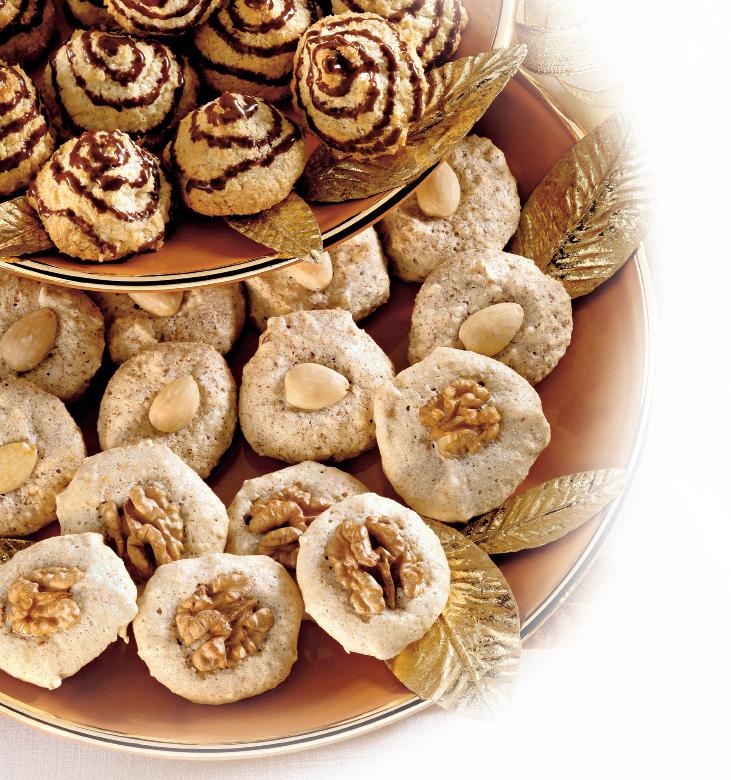 4. Se încălzeşte cuptorul în prealabil. Se tapetează tava cu hârtie pentru copt şi se toarnă, cu ajutorul unui poş cu şpriţ, compoziţia de pricomigdale. Formele pot fi variate. După ce s-au turnat în tavă, o parte se ornează cu miez de nucă şi migdale, iar cealaltă parte, după ce s-au scos din cuptor, se stropesc cu ciocolată topită la baie de aburi. Se coc la început 10 minute, cu uşa aragazului închisă şi 30 de minute cu uşa deschisă.