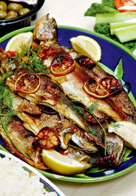 4. Pentru un gust deosebit, pe platou se aşază frunze de mărar proaspăt şi spălat, un rând de păstrăvi, felii de lămâie, se stropesc cu zeamă de lămâie şi cu puţin ulei de măsline. Se servesc cu mămăliguţă caldă.