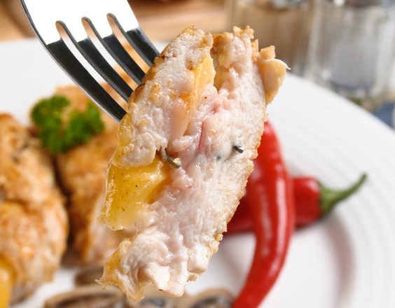 Crestează puiul (de-a latul) aproape de tot, crestăturile fiind la o distanță de aproximativ 2,5 cm una de cealaltă. Taie fiecare felie de șuncă astfel încât să se potrivească mărimii “portofelului” crestat de tine și feliile de cașcaval la fel.