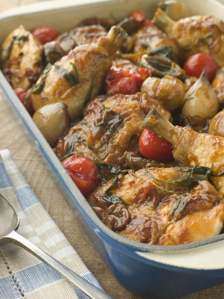 2. Se pregăteşte o tava pentru cuptor şi se aşază pulpele, ceapa întreagă, roşioarele întregi şi ardeii tăiaţi fâşii. Se presară restul de ulei şi se bagă la cuptor la o temperatură de 160 grade.
