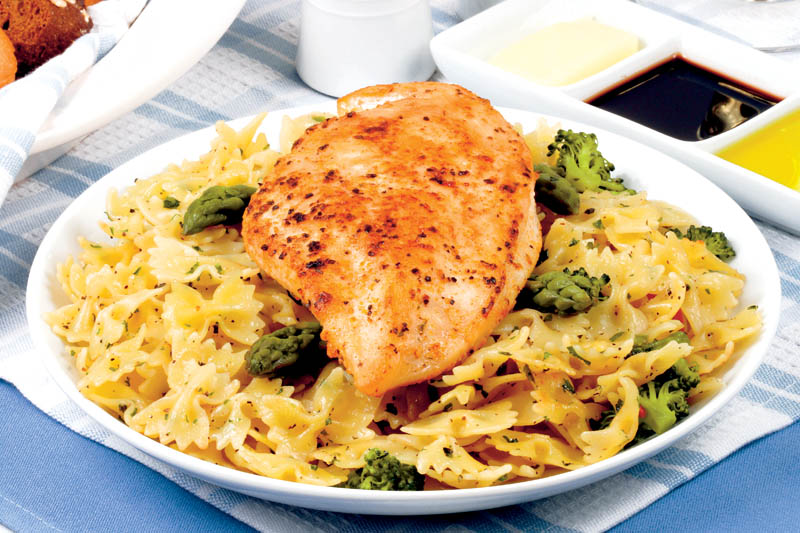 2. Separat, se pregăteşte pieptul de pui. Se curăţă de pieliţe, se spală bine, se porţionează în bucăţi şi se pun la scurs pe un prosop absorbant de bucătărie. Se pune într-o tigaie uleiul la încins şi se aşază bucăţile de pui care, între timp, au fost condimentate cu sare şi puţin piper alb şi se prăjesc. Se întorc de pe o parte pe cealaltă până se rumenesc. Se scot din tigaie şi se lasă să se scurgă de ulei. Se presară pe deasupra cimbru proaspăt sau uscat.