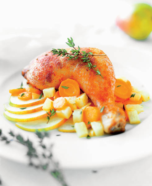 4. La sfârşit se curăţă perele de coajă şi se taie rondele. Restul de unt rămas, adică un cubuleţ, se topeşte, iar peste el se pun feliile de pere. Se lasă să se călească puţin până îşi schimbă culoarea şi lasă un sos dulce-acrişor. Se aşază pulpele pe un platou, se toarnă sosul peste ele şi peste legume şi se pun şi feliile de pere. Platoul se ornează cu cimbru şi se bagă 10 minute la cuptor.