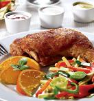 4. Pulpele se scot pe un platou şi se servesc cu garnitura de portocale şi legume. Se ornează cu busuioc.