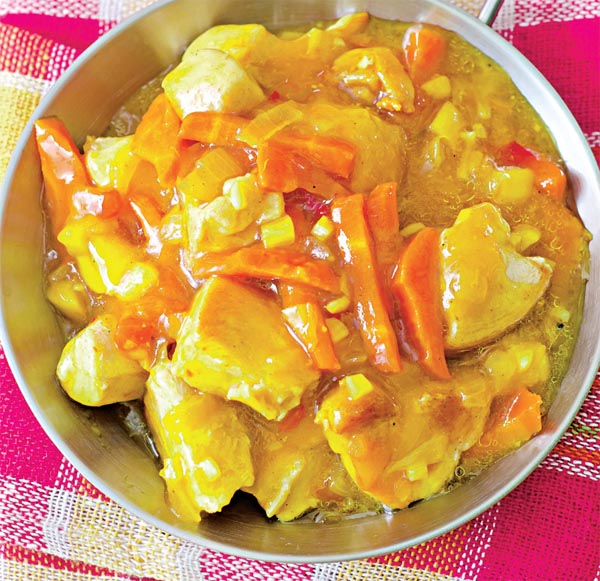 2. Se încinge uleiul şi se prăjesc bucăţile de pui. Când s-au rumenit frumos, se adaugă ceapa tăiată peştişori, morcovii tăiaţi lamele cât mai fine, ardeiul, cubulețe, foile de dafin, usturoiul și ghimbirul. Se amestecă şi se lasă 4-5 minute pe foc.