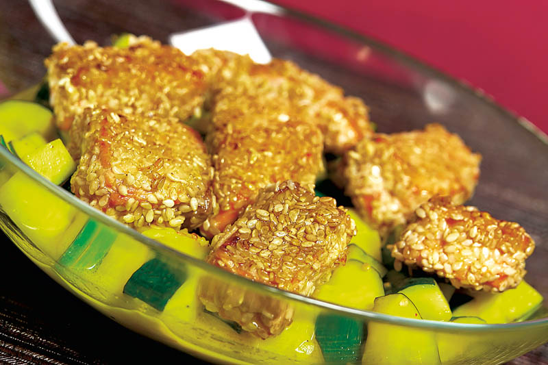 4. După ce s-au rumenit dovleceii, se scot şi se servesc cu bucăţelele de pui cu susan.