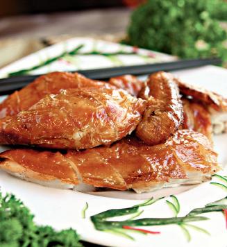 4. Sosul se strecoară, ca să nu se simtă firele de ceapă şi se toarnă peste bucăţile de pui. Platoul se ornează cu frunze de salată sau de varză creaţă şi crenguţe de rozmarin. Puiul se serveşte cu garnitură de orez sau de fidea.
