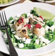 2. Mazărea fiartă se amestecă cu salata şi ceapa verde mărunţite. Se condimentează cu ulei, zeamă de lămâie, cimbru, busuioc şi miere. Puiul se serveşte cu salată, brânză feta şi rondele de ardei iute.