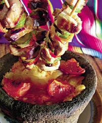 2. Separat, se taie pieptul de pui bucăţi potrivite, la fel şi ardeii, dovlecelul, roşiile şi ananasul şi se pun într-un bol. Se condimentează cu praf de chili, sare, piper roşu şi, la sfârşit, se adaugă untul topit şi răcit. Se amestecă şi se lasă la rece câteva minute. După ce au stat la macerat, se înfig pe beţele de frigărui şi se coc pe grătar. Se răsucesc la intervale de 5 minute până se rumenesc uniform.