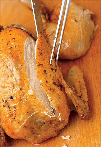 6. Spre sfârşit, se stropeşte puiul cu 4-5 linguri de vin alb şi puţin unt şi se mai lasă 5-10 minute. Se serveşte fierbinte cu garnitură de orez.