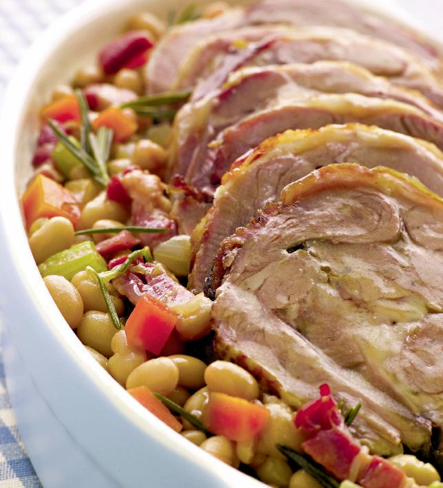 4. Fasolea fiartă se căleşte în puţin ulei împreună cu ceapa roşie şi cu morcovul tăiat cubuleţe, se condimentează cu sare şi piper, după gust, şi se lasă să se înăbuşă în cuptor. Pulpa de miel se serveşte cu garnitura de fasole şi se ornează cu rozmarin.