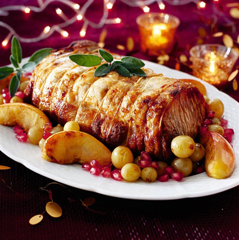 2. Se ia carnea din castron, se pune într-o tavă mare, se aşază deasupra feliile de bacon şi, ca să nu se desfacă, se leagă strâns cu o sfoară de jur împrejur toată bucata de carne. Deasupra, se toarnă lichidul în care a stat carnea. Se mai pun în tavă merele tăiate felii şi boabele de struguri şi se bagă la cuptor. Se lasă timp de o oră, dar se verifică din când în când.
