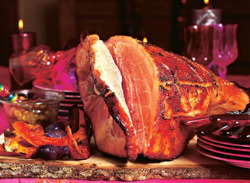 4. Stafidele, se lasă să se macereze în 2-3 linguriţe de rom. Înainte cu 30 de minute de a scoate pulpa din cuptor, se presară stafidele şi se lasă la foc mic. Pulpa se feliază şi se serveşte cu sosul acrişor de stafide, cu dovleacul tăiat feliuţe şi ornat cu boabe de struguri.