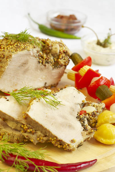 1. Se curăţă pulpa de porc de pieliţele, se unge cu ulei, se condimentează cu sare, piper, boia şi susan, se stropeşte cu puţin vin şi se lasă câteva minute la frigider.
