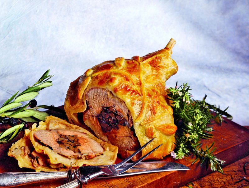 4. Pulpa umplută se aşază într-o tavă de friptură, se unge cu ulei, miere şi se presară sare şi piper pe toată suprafaţa. Se stropeşte cu apă şi vin şi se bagă în cuptor, la foc mic. Din când în când, se stropeşte cu vin şi, spre sfârşit, se presară cimbru şi rozmarin. Se serveşte caldă sau rece, cu salată verde.