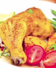 1. Pulpele de pui se curăţă de pieliţe, se spală bine, se crestează şi se condimentează cu sare, piper, boia dulce şi iute, se împănează cu usturoi şi frunzuliţe de rozmarin.