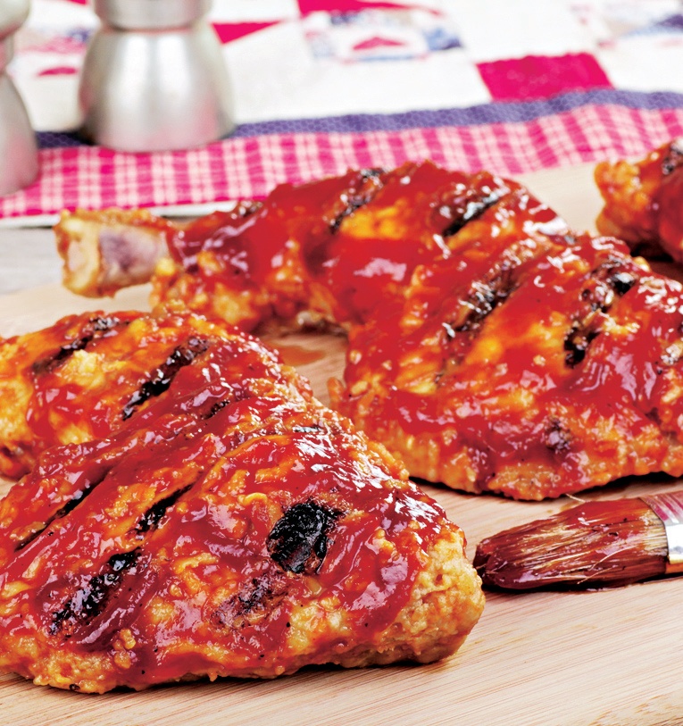 3. Imediat ce carnea s-a rumenit frumos pe ambele parţi, se scoate de pe gratar si se unge cu sos. Se serveste imediat, cu garnitura la alegere.