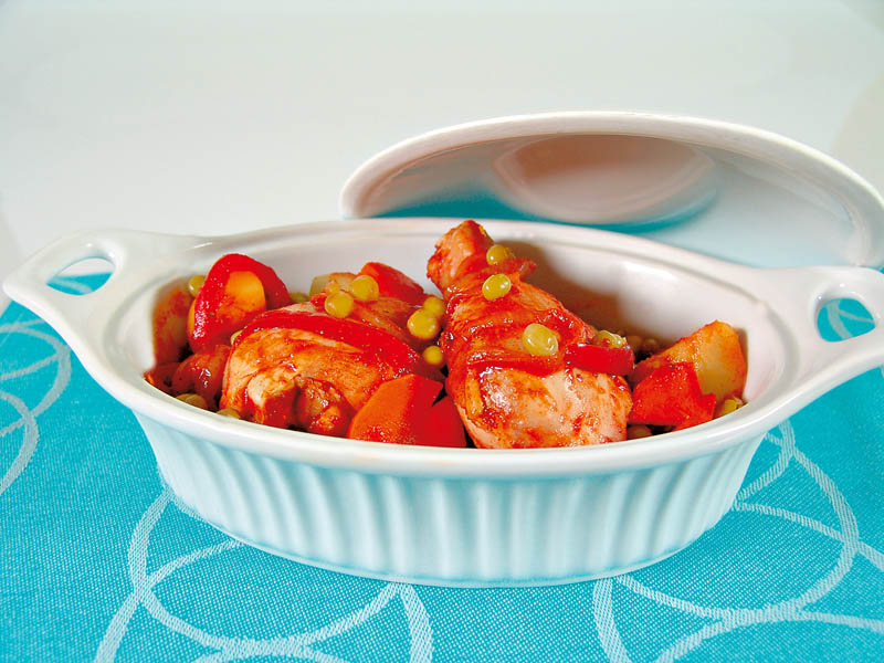 4. Între timp, se prăjesc copanele, se rumenesc şi se amestecă cu ostropelul. Se ornează cu pătrunjel verde, rondele de morcov crud şi bobiţe de mazăre.