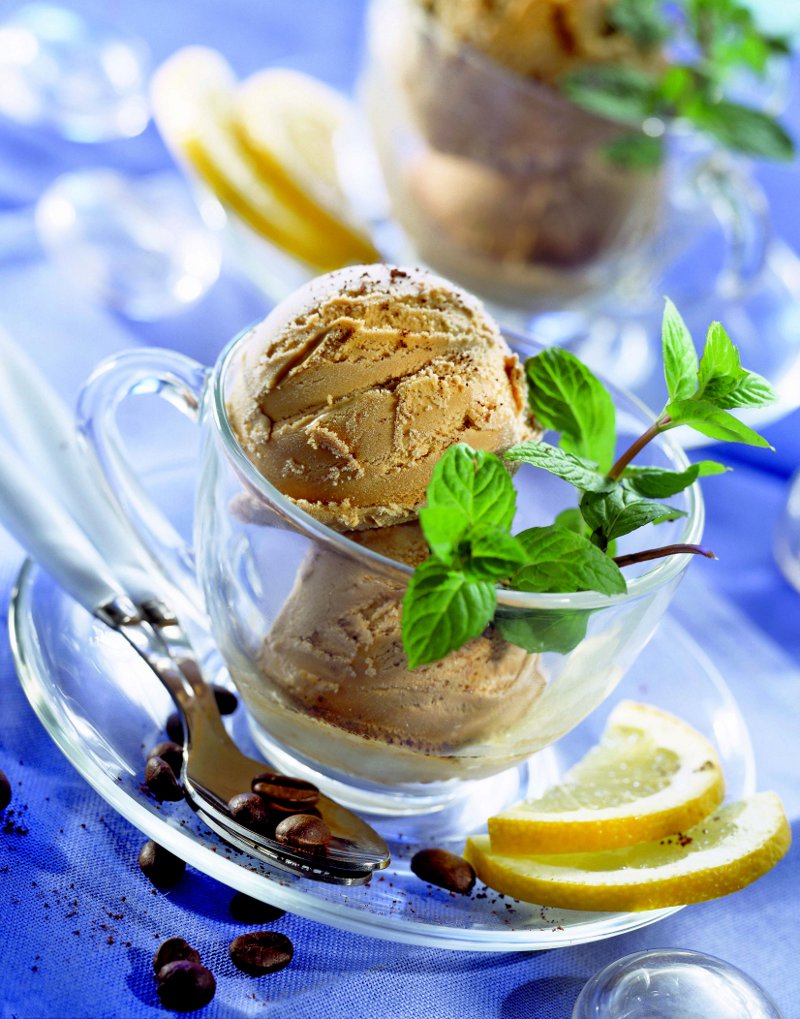 4. Se lasă la îngheţat aproximativ 4-5 ore, apoi se toarnă în cupe şi se ornează cu mentă.