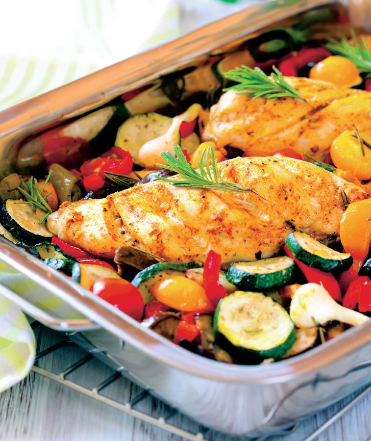 2. Se curăţă şi se spală legumele, apoi se taie feliuţe. Se pune uleiul de porumb într-o tigaie şi se căleşte pentru început ceapa. Se adaugă usturoiul şi puţină apă călduţă. Se pune ardeiul şi, la sfârşit, dovleceii tăiaţi rondele. Se călesc 30 de minute şi, după ce s-au rumenit, se adaugă roşiile tăiate jumătăţi. La sfârșit, se condimentează şi se pun în tavă cu pieptul de pui. Se dau la cuptor 30 de minute.