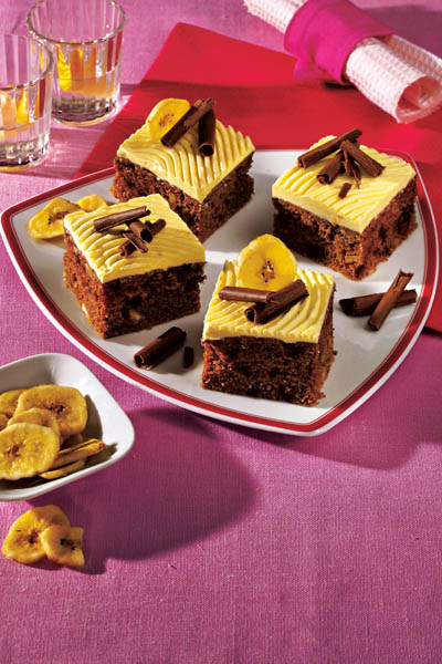 4. Separat, se zdrobesc bananele, se stropesc cu zeama de la o lâmâie şi se dau la rece. În acest timp, se freacă untul cu zahărul, vanilia şi gălbenuşurile şi se amestecă cu pasta de banane. După ce s-a răcit blatul, se întinde crema şi se ornează cu feliuţe de banane şi fulgi de ciocolată amăruie.