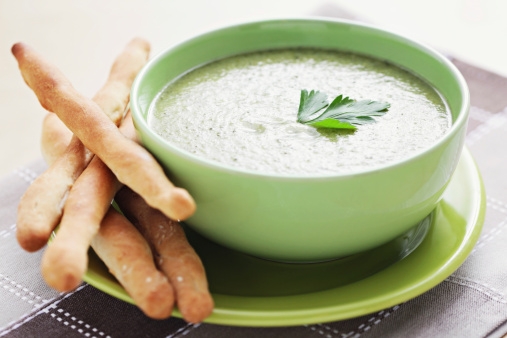 4. Crema de broccoli se subțiază cu zeama în care au fiert legumele. Se serveşte cu fâșii de broccoli şi usturoi.