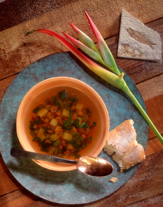 3. Restul legumelor se curăță, se spală, se taie cubulețe și se călesc în puţin ulei. Se adaugă fasolea uscată fiartă, mazărea și fasolea verde. Se pun într-o oală la fiert, în apă călduță, la foc mediu.