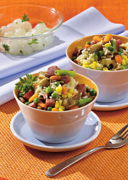 2. Se adaugă orezul, mazărea, porumbul, morcovii şi dovlecelul tăiat cubuleţe şi se călesc la foc mic. După câteva minute se adaugă un pahar cu apă clocotită, se condimentează cu sare şi piper, apoi se lasă să fiarbă la foc mic.