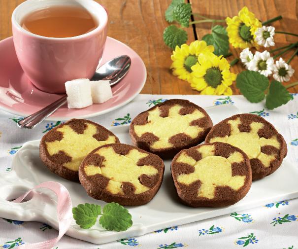 1. Se amestecă într-un vas zahărul pudră cu făina. Se adaugă zahărul vanilat, coaja de lămâie şi margarina tăiată cubuleţe. Se amestecă bine, până se obţine o compoziţie omogenă, care se împarte în două jumătăţi. În una dintre ele se adaugă cacaua şi se mai amestecă bine până se încorporează. Se pun aluaturile în folie, separate, şi se bagă la frigider, timp de 30 de minute.