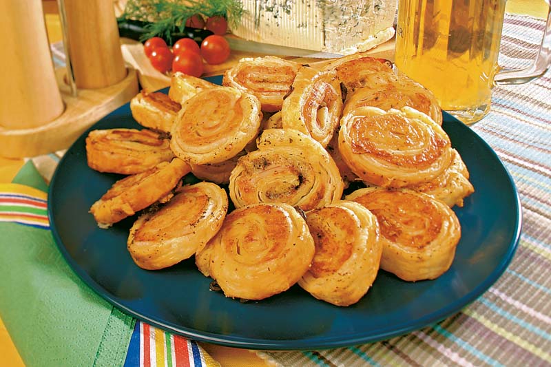 2. Se întinde aluatul. Se aşază feliile de şuncă una lângă alta, apoi se rade caşcavalul şi se presară pe şuncă. Se rulează aluatul şi se taie transversal în rondele groase de 1,5 cm.