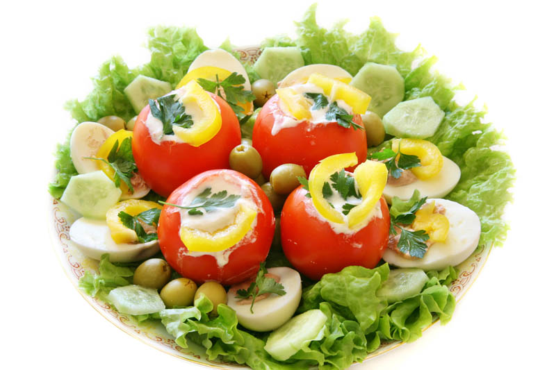 3. Se umplu roşiile cu cremă de brânză. Se aşază pe un platou ornat cu salată verde, castraveţi tăiaţi rondele şi ouă fierte tăiate jumătăţi. Se servesc imediat.