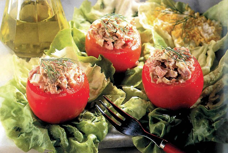 3. Gălbenuşurile se pasează cu furculiţa şi se freacă cu muştar, ulei şi pătrunjelul tocat mărunt. Se pune peste ciuperci şi pieptul de pui şi se amestecă uşor. Roşiile se umplu cu această compoziţie, apoi se ornează cu mărar şi se servesc ca aperitiv.