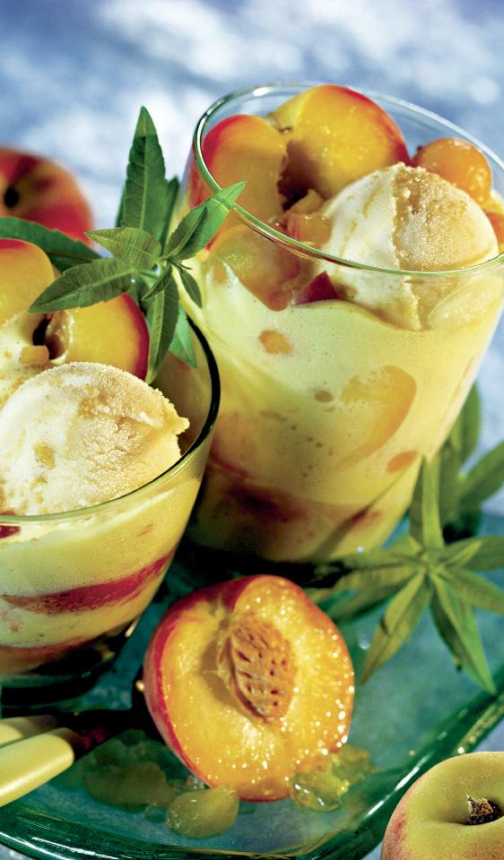 5. Pentru piureul de piersici, se pun apa şi zahărul să fiarbă. Se lasă să scadă, se adaugă zeama şi coaja de lămâie şi, spre sfârşit, piersicile, atât pasate, cât şi bucăţi mai mari. Se lasă să se răcească şi, după ce s-a făcut şi îngheţata, se aranjează în cupe şi se ornează cu frunze de mentă şi coaja de lămâie verde.