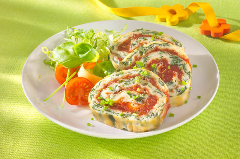 4. Pasta de brânză se întinde uniform pe fiecare clătită, apoi se întinde pasta de roşii şi se rulează cu atenţie să nu se desfacă. Se lasă câteva minute la frigider şi apoi se taie şi se servesc ornate cu salată verde, busuioc şi felii de roşii.