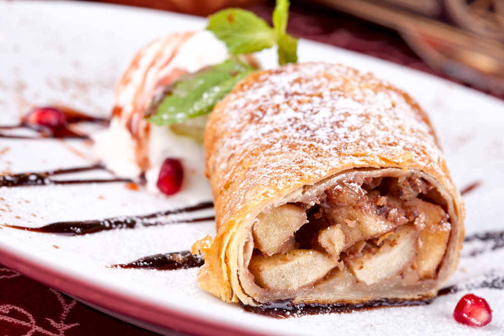 Învaţă să prepari o ruladă delicioasă cu mere şi sos de caramel cu nuci.