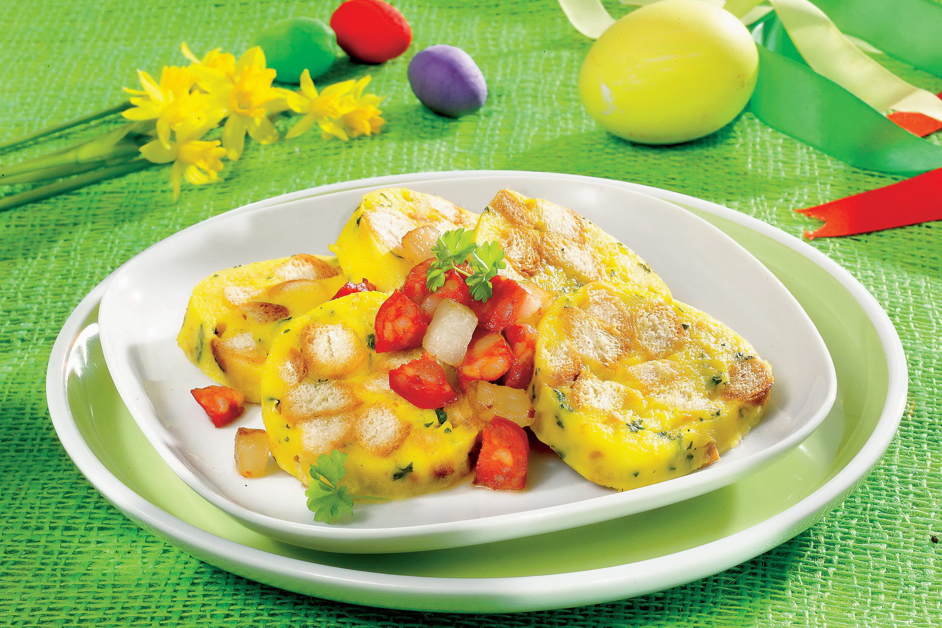 3. Compoziţia obţinută din cartofi, unt, gălbenuşuri, făină şi verdeaţă se întinde cu ajutorul sucitorului într-o foaie groasă. Se pun crutoanele în mijlocul foii, apoi se rulează uşor, prinzându-se bine la capete. Găluşca obţinută se pune la fiert într-un vas cu grătar, în apă sărată, 30-35 de minute.